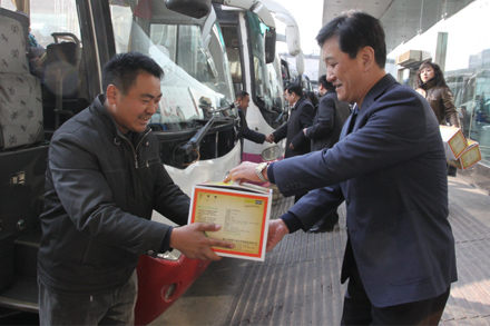 2月2日是大年三十,下午兩點(diǎn)鐘,集團(tuán)公司領(lǐng)導(dǎo)來(lái)到總站南北兩區(qū),走訪看望車站干部職工,歡送春運(yùn)末班車,并向駕乘人員贈(zèng)送了春節(jié)紀(jì)念品。在總站候車大廳,吳宗昌董事長(zhǎng)簡(jiǎn)要回顧了節(jié)前春運(yùn)的整體情況,感謝大家春運(yùn)期間的辛勤工作,代表領(lǐng)導(dǎo)班子向所有干部職工拜年,并與車站干部職工合影留念。來(lái)到發(fā)車區(qū),吳宗昌董事長(zhǎng)、王謙總經(jīng)理帶領(lǐng)集團(tuán)公司領(lǐng)導(dǎo)班子分別慰問(wèn)了春運(yùn)末班車的駕乘人員,贈(zèng)送了春節(jié)紀(jì)念品,并囑咐他們開(kāi)好最后一班車,把旅客安全送回家。