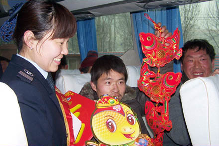 今年春運(yùn)期間,山東交運(yùn)集團(tuán)提前八天進(jìn)入了春運(yùn)狀態(tài),汽車東站根據(jù)今年農(nóng)民工返鄉(xiāng)運(yùn)輸仍將增長的需求,多措并舉,提前部署安排民工返鄉(xiāng)運(yùn)輸工作,組織人員及時走訪各類建筑工地調(diào)查摸底,統(tǒng)計包車線路,發(fā)放班車時刻信息表,宣傳班次信息,結(jié)合農(nóng)民工集中返鄉(xiāng)的需求,確定返鄉(xiāng)時間和線路。并在包車當(dāng)日將車站的優(yōu)質(zhì)服務(wù)帶到了建筑工地,宣傳乘車注意事項(xiàng),幫助農(nóng)民工朋友調(diào)試座椅、系好安全帶,發(fā)放暖手寶驅(qū)除嚴(yán)寒。身披綬帶的服務(wù)人員還為他們送上了福字、對聯(lián)、賀歲吉祥物等新春禮品。并現(xiàn)場辦理了免費(fèi)行包托運(yùn),讓農(nóng)民工朋友返鄉(xiāng)一路無憂。