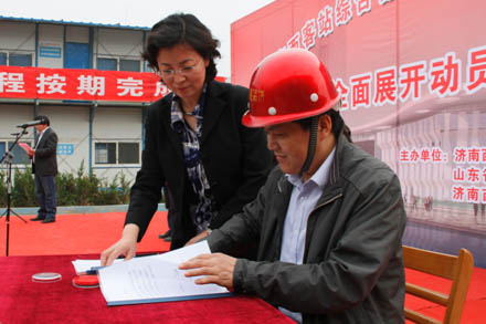 會議期間,參建單位代表濟南市建設(shè)監(jiān)理有限公司、濟南建設(shè)設(shè)備安裝有限責任公司和山東富達裝飾工程有限公司的負責人分別進行了信心百倍、斗志昂揚的表態(tài)發(fā)言,并帶領(lǐng)各參建單位簽訂承諾書。