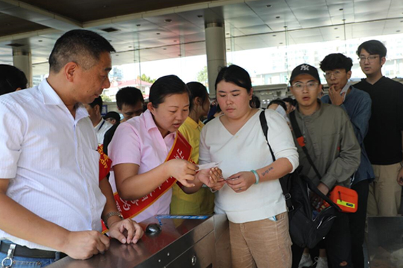 黃金周期間,集團公司黨委、團委廣泛發(fā)動各單位黨團組織開展主題黨日、團日活動,引導非客運單位黨員、團員青年骨干到總站南北兩區(qū)各候車大廳和發(fā)車場,為旅客提送行李、導乘指引,努力分擔一線服務(wù)人員工作壓力;集團總部黨總支以5個黨支部為單位,結(jié)合自身業(yè)務(wù)范疇,積極協(xié)調(diào)、合理安排,在運輸最繁忙時期充實到車站現(xiàn)場,進行業(yè)務(wù)協(xié)調(diào)、車輛調(diào)配、安全監(jiān)督以及客流疏導。22名管理人員戴起黨徽、袖章,分布在一線相關(guān)崗位,亮身份、樹形象,為繁忙的運輸工作盡心竭力。各客運公司、車站團組織成立志愿服務(wù)隊,根據(jù)運輸形式,組織本單位團員青年開展跟車服務(wù)、現(xiàn)場協(xié)助、利用青年人善于使用網(wǎng)絡(luò)技術(shù)的特點,引導旅客手機購票,大大緩解了站內(nèi)排隊購票的緊張局面。