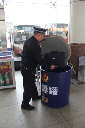 演練現(xiàn)場模擬車站治安科在巡邏中發(fā)現(xiàn)疑似爆炸物品行李箱,各崗位立即啟動防爆應(yīng)急預(yù)案。防爆領(lǐng)導(dǎo)小組成員迅速按職責(zé)分工各就各位;應(yīng)急疏散、設(shè)備保障、綜合服務(wù)等小組對旅客進(jìn)行有序疏散;治安人員第一時間對現(xiàn)場進(jìn)行緊急處置;售票處按實戰(zhàn)標(biāo)準(zhǔn)停止售票、設(shè)置警戒區(qū),安全轉(zhuǎn)移票據(jù)票款。同時責(zé)任人員利用車站防爆桶實施險情排除,通過調(diào)取監(jiān)控錄像等方式搜索嫌疑人,并及時實施抓捕,在確認(rèn)疑似爆炸物及恐怖襲擊隱患排除后,解除應(yīng)急狀態(tài),恢復(fù)正常運輸秩序。