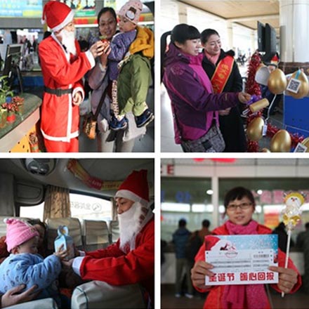 圣誕元旦創(chuàng)服務(wù) 圣誕節(jié)期間,總站各部門推出了形式多樣、精彩紛呈的“圣誕”活動:售票處舉辦了“圣誕暖心回報”活動,只要現(xiàn)場關(guān)注總站微信可享受購票9折優(yōu)惠,購票超100元獲贈精美禮品一份;服務(wù)臺將廢舊塑料瓶制作成精美的花盆,栽種綠色植物送給來總站乘車的小朋友;熱線開展了“訂票有好禮”活動,凡撥打總站熱線電話預(yù)定元旦車票并成功取票的旅客,都可獲得精美禮品一份;稽查科推出了“圣誕送平安”活動,凡到總站乘車的小朋友都有機(jī)會在出站時領(lǐng)取到“圣誕老人”送出的平安果;檢票處舉辦了“圣誕購票送驚喜”和“圣誕嘉年華”活動,圣誕節(jié)期間到總站購買2015年1月4日—2015年2月17日期間春運客票的旅客,可免費領(lǐng)取精美禮物一份,參加擲飛鏢、踢毽子等多項活動,并體驗“砸金蛋”的快樂。在新年到來之際,服務(wù)臺開展了“幸??燔?,駛向2015幸福彼岸”活動,凡到總站乘車的旅客均可以與“幸福快車”合影留念。只要將合影照片分享至朋友圈,并關(guān)注總站微信就可以獲得新年禮物一份。
