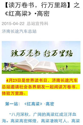 不僅如此,總站還制作了“讀萬(wàn)卷書(shū),行萬(wàn)里路”系列專(zhuān)題微信,通過(guò)總站官方微信、總站官方微博,以圖文并茂的形式進(jìn)行推送。專(zhuān)題內(nèi)容包含當(dāng)下熱銷(xiāo)書(shū)籍及相關(guān)介紹,倡導(dǎo)大家親臨故事現(xiàn)場(chǎng),切身體會(huì)主人公的心路歷程,同時(shí)也為總站傳播文化、加強(qiáng)文化建設(shè)開(kāi)辟了新途徑。