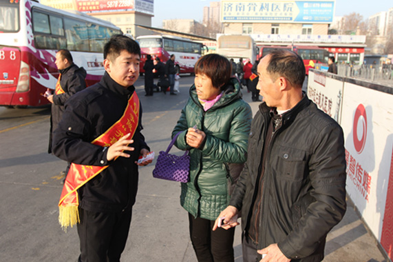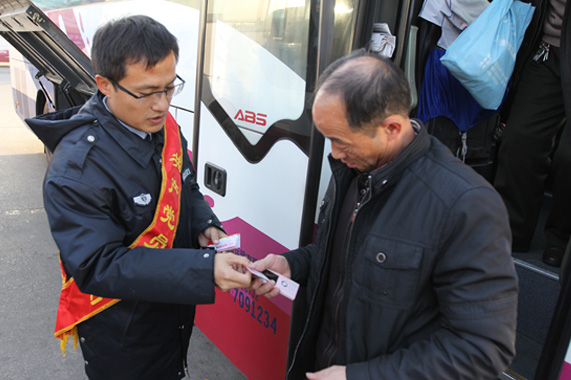 12月26日,總站南區(qū)黨委在旅客到達(dá)區(qū)針對(duì)返程旅客開展了營(yíng)銷拓展活動(dòng),向到站旅客派發(fā)印有2016年全年日歷的“感恩回饋會(huì)員卡”,并在客流密集區(qū)進(jìn)行班車和旅客的疏導(dǎo)和服務(wù)工作,確保服務(wù)區(qū)域內(nèi)車流、人流暢通有序,秩序井然;同時(shí)還主動(dòng)為旅客搬送貨物、引導(dǎo)貨物辦理業(yè)務(wù);以優(yōu)惠卡為媒介,推廣南區(qū)微信公眾平臺(tái),幫助旅客通過微信購票,享受優(yōu)惠、便捷的售票服務(wù)。