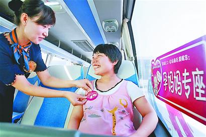 總站南區(qū)的工作人員告訴記者,在總站南區(qū)乘車的孕媽媽們都可免費領取到徽章,并可憑徽章享受總站南區(qū)專為孕媽媽提供的優(yōu)先購票、優(yōu)先咨詢、優(yōu)先檢票、優(yōu)先乘車等服務;在距離總服務臺不到兩米的地方便是總站南區(qū)專為孕媽媽設立的孕媽媽候車專區(qū)。記者看到,坐席上全都鋪著竹涼席,后面是一臺五匹的立式空調(diào),還有免費的飲用水,旁邊的閱報欄里擺滿了可免費閱讀的報紙以及雜志。